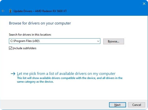 - Click “Browse” and navigate to the folder where the driver is downloaded.